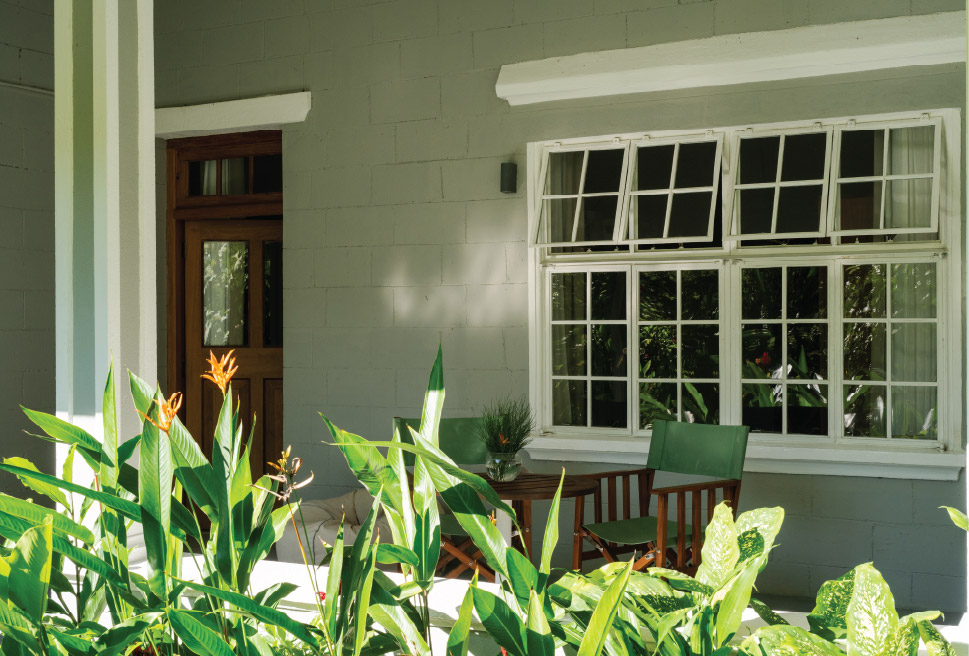 An atmospheric, coir-floored bedroom with twin beds, an ensuite bathroom, and direct access to a private garden terrace.