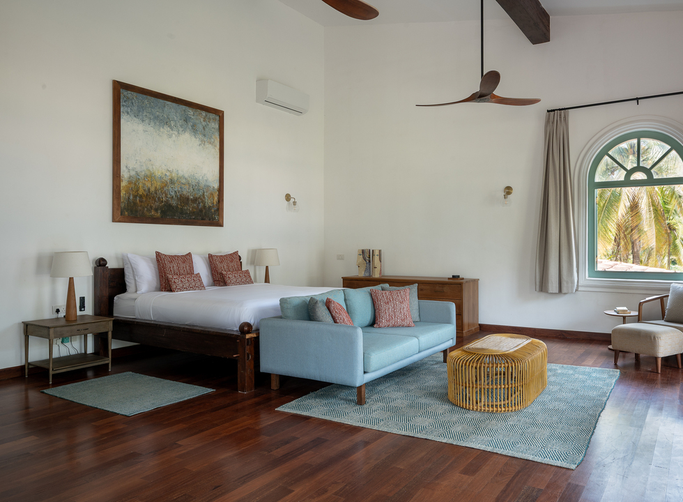 The master bedroom has a grand four-poster garden-facing bed and an ensuite bathroom with rain shower and freestanding bathtub, and its open plan design incorporates a sofa-furnished lounge. The second bedroom – furnished with queen-sized twin beds – also has its own shower room. The suite is equipped with walk-through wardrobes, cable television, retro phone, and mini bar. A blissful suite for privacy-seeking honeymooners or families.