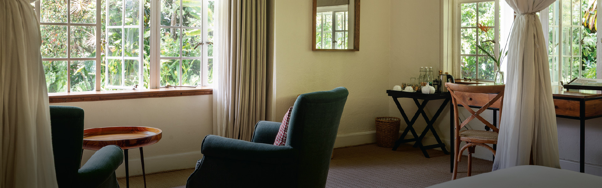 An atmospheric, coir-floored bedroom with twin beds, an ensuite bathroom, and direct access to a private garden terrace.